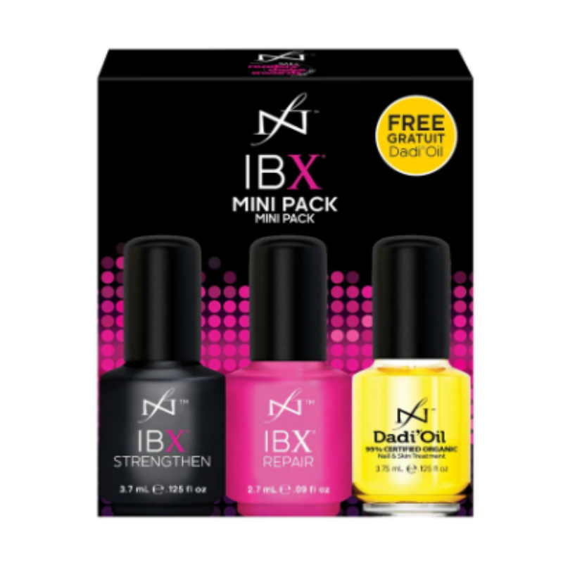 The IBX Strengthen, Repair, & Dadi' Oil Mini Pack is a revolutionary 2-part system used on natural nails or under gel polish as a natural strengthening system. Includes mini sizes of IBX Repair, IBX Strengthen, and Dadi’ Oil. Does approximately 35 full sets.